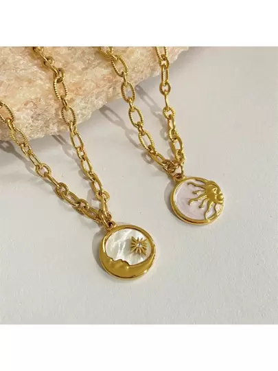 Vintage 3d Sun And Moon Round Pendant Necklace, Gold-Plated Collarbone Chain - Multicolor - View 1