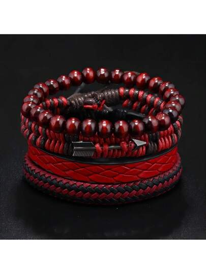 Vintage Style Red Cupid's Arrow Leather Bracelet Set (Unisex) - Multi-Layer Braided Wristbands - Red - View 1