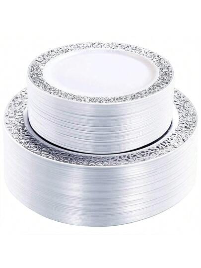 102PCS Silver Plastic Plates-Reusable Plates With Silver Rim- Lace Design Plates Including 51Plastic Dinner Plates 10.25inch,51 Salad Plates 7.5inch - Silver - View 1
