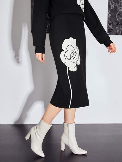 MOTF PREMIUM WOOL-MIX LARGE FLORAL KNIT SKIRT - Black - View 1