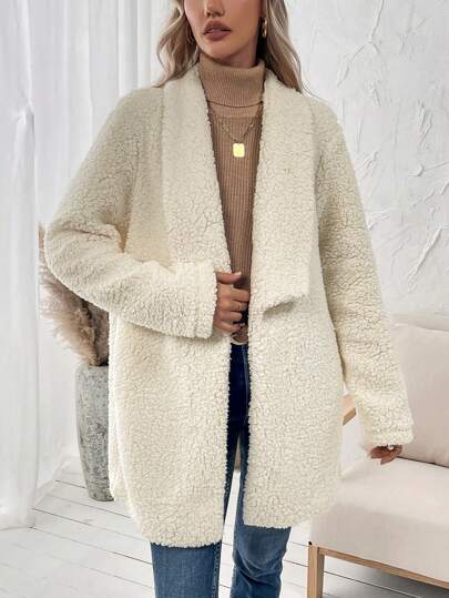 SHEIN LUNE Waterfall Collar Open Front Teddy Coat - Apricot - View 1