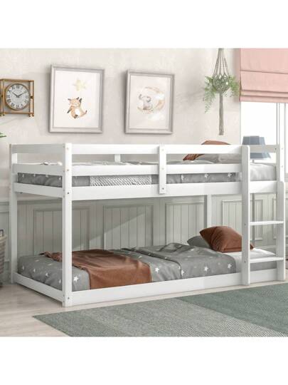 Twin Over Twin Bunk Bed With Full Guardrails And Ladder,Low Bunkbed Fram W/Safety Guard Rails For Teens Adults No Box Spring Need - White - View 1