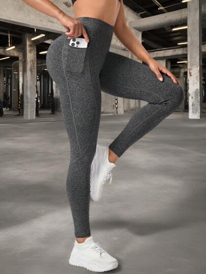 SHEIN Sports Wide Waistband Phone Pocket Side Sports Leggings - Dark Grey - View 1