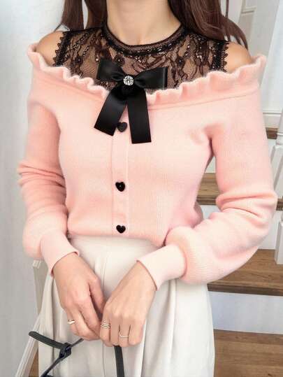 FRIFUL Women's Lace Splice Off Shoulder Pullover Sweater - Baby Pink - View 1