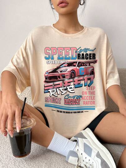 SHEIN EZwear Women's Racing Slogan Graphic T-Shirt - Apricot - View 1