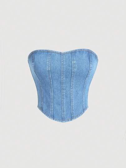 SHEIN Women's Asymmetric Hem Denim Bustier Top - Light Wash - View 1