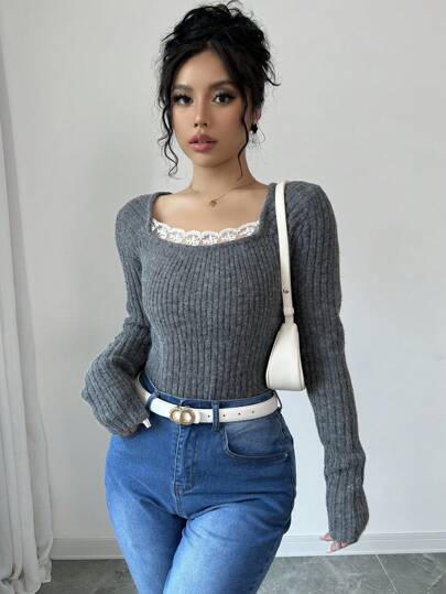Chiquease Women's Autumn & Winter Contrast Lace Crew Neck Long Sleeve Fitted Ribbed Sweater, Knit Pullover Fall - Grey - View 1