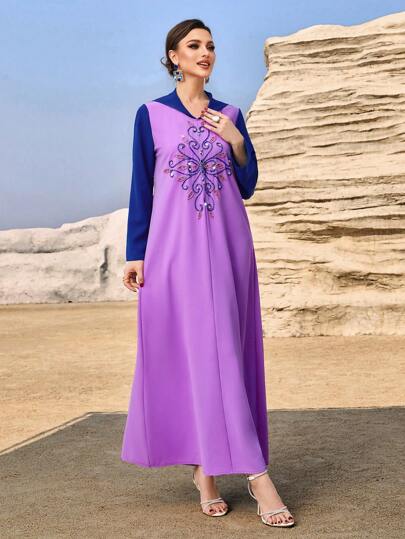 Layrah Women's Bead Embellished Moroccan Style Color Block Robe Djellaba Dress With Hood, Elegant Luxury Evening Party Style - Multicolor - View 1