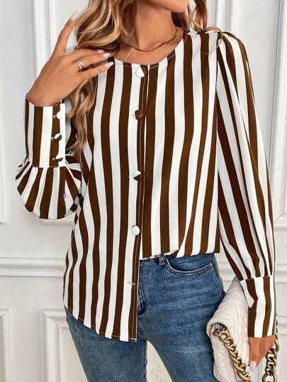 SHEIN LUNE Women's Button Front Long Sleeve Striped Minimalist Casual Blouse Fall Cloth For Women - Brown - View 1