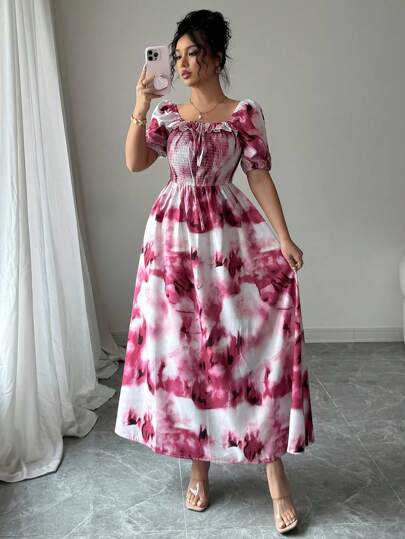 Modelyn Women's Cinched Waist Floral Print Ruffle Hem A-Line Dress - Red - View 1