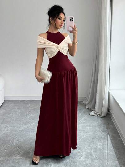 Rafferiza Women's Color Block Open Shoulder Long Dress - Burgundy - View 1