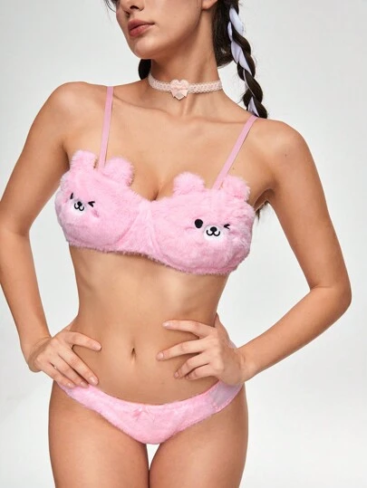 ROMWE Women's Cute Plush Bear Wireless Bra Set, Kawaii - Pink - View 1