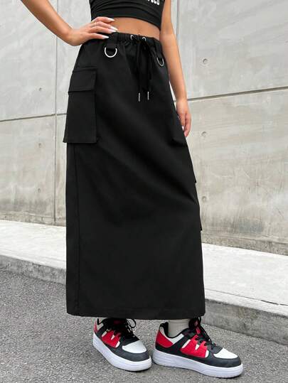 SHEIN Coolane Women's Drawstring Waist Cargo Skirt With Pockets - Black - View 1
