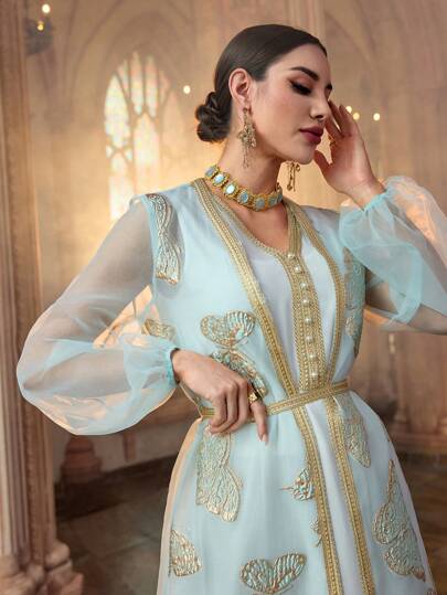 Al Najma Women's Elegant Butterfly Pattern Turkish & Arabic Traditional Long Dress Kaftan Jalabiya Dress - Mint Green - View 1