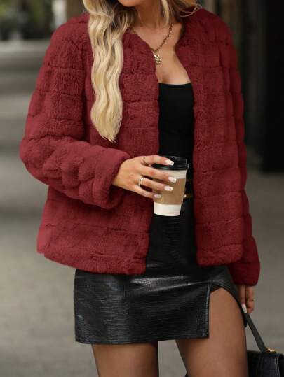 SHEIN Clasi Women's Elegant Fluffy Collar Solid Color Jacket, Autumn/Winter - Red - View 1