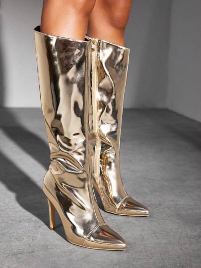 CUCCOO SZL Women's Fashion Pointed Toe High Heel Knee-High Boots Spring Shoes Spring Break Easter - Gold - View 1