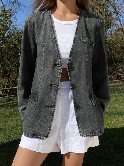 DAZY Women's Front Button Long Sleeve Pocket Denim Casual Jacket - Black - View 1