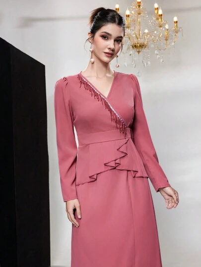 Modelyn Women's Patchwork Ruffled Hem Puff Long-Sleeved Top And Skirt Two-Piece Set 2 Piece Set Fall Cloth For Women - Pink - View 1