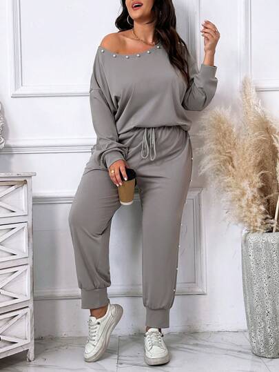 SHEIN LUNE Women's Plus Size Pearl Detail Drop Shoulder Sweatshirt And Jogger Pants Set - Light Grey - View 1