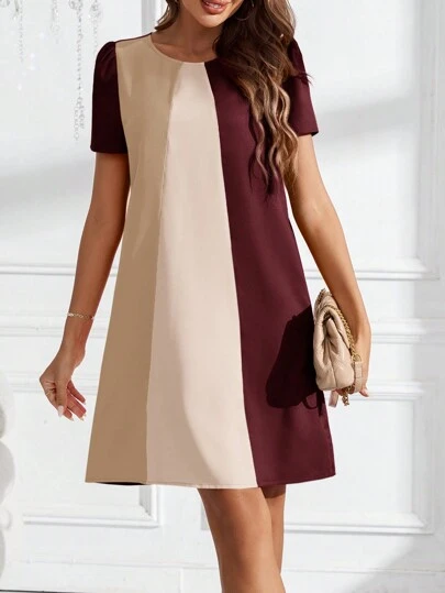SHEIN Clasi Women's Round Neck Colorblock A-Line Short Casual Dress - Brown - View 1