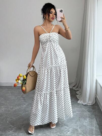 Elenzga Women's Simple Commuter Polka Dot Floral Decor Halter Neck Dress - White - View 1