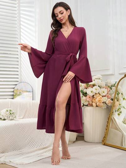 Women's Solid Color Casual Loungewear Robe With Long Sleeves - Purple - View 1