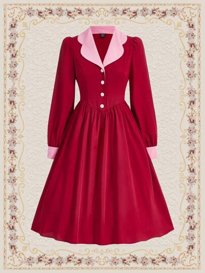 Vintamour Women's Vintage Color Block High Neck Dress - Burgundy - View 1