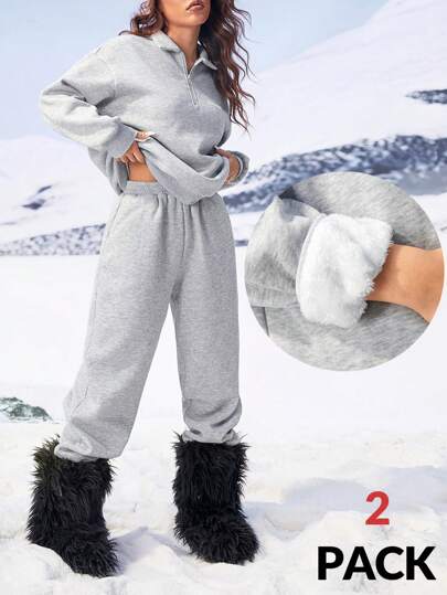 SHEIN EZwear Women's Winter Couple Same Style Daily Wear Basic With Fleece Keep Warm Sweatshirt And Joggers,2pcs Clothes Set - Grey - View 2
