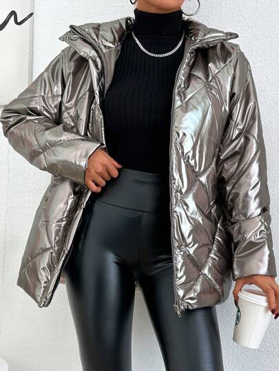 SHEIN Cottnline Women's Zipper Front Long Sleeve Puffer Coat - Silver - View 1