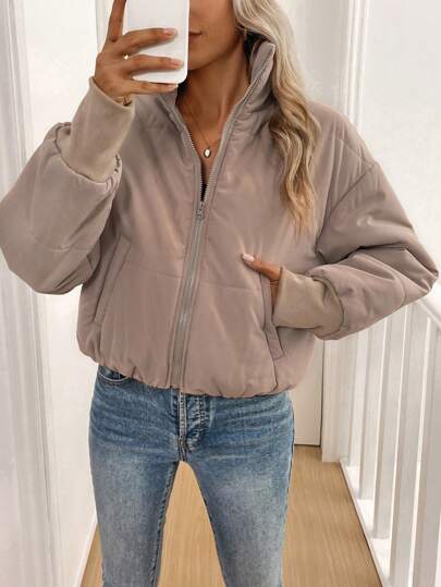 SHEIN LUNE Women's Zipper-Up Basic Turtleneck Short Padded Padded Coat Clothes Winter Fall Cloth For Women - Khaki - View 1