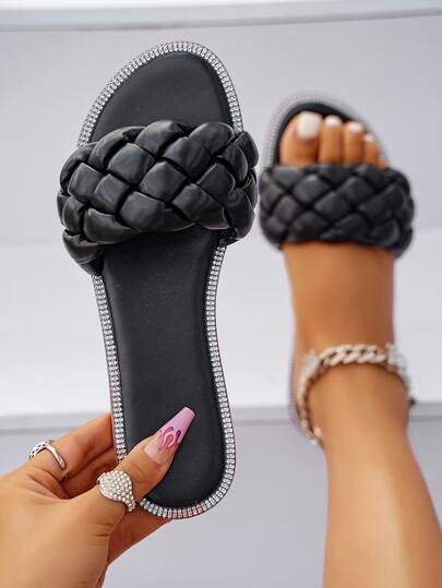 Women Braided Detail Rhinestone Decor Flat Sandals, Fashionable Black Slide Sandals - Black - View 1