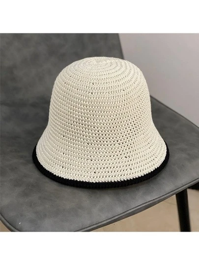 Contrast Trim Crochet Bucket Hat - Beige - View 1