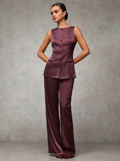 SHEIN BAE Women Chestnut & Burgundy Plain Front Button Sleeveless Casual Top & Pants Set - Coffee Brown - View 1