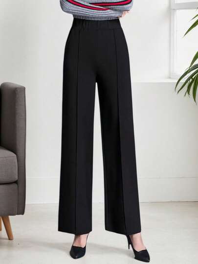 Women Daily Wear Solid Color Wide Leg Pants - Black - View 1
