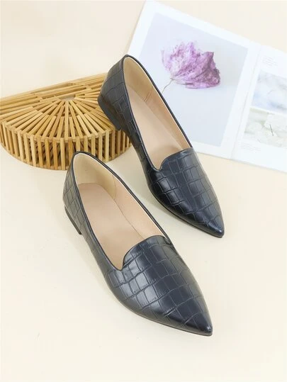 Crocodile Embossed Point Toe Flat Loafers - Black - View 1