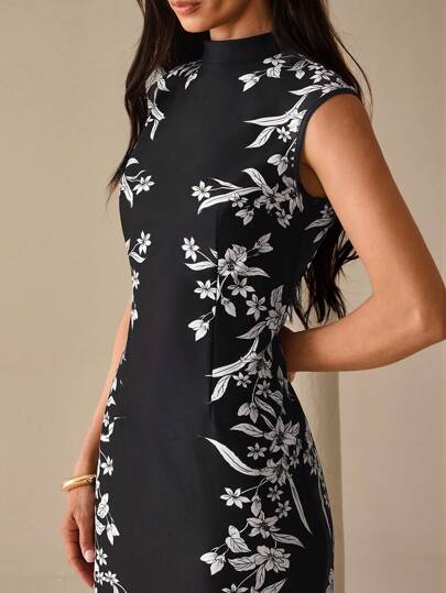 Lilora Women Floral Print Stand Collar Sleeveless Mid-Length Dress - Black - View 1