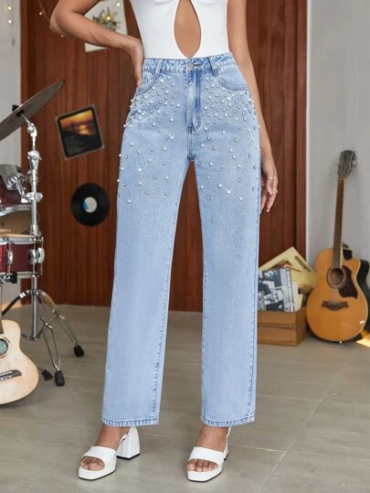 Pearls Beaded Straight Leg Jeans - Light Wash - View 1