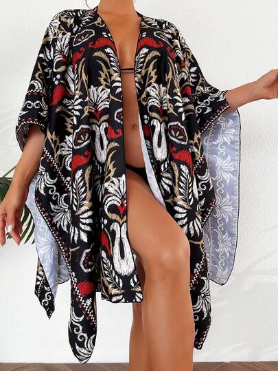 SHEIN Swim Summer Allover Print Batwing Sleeve Kimono - Black - View 1