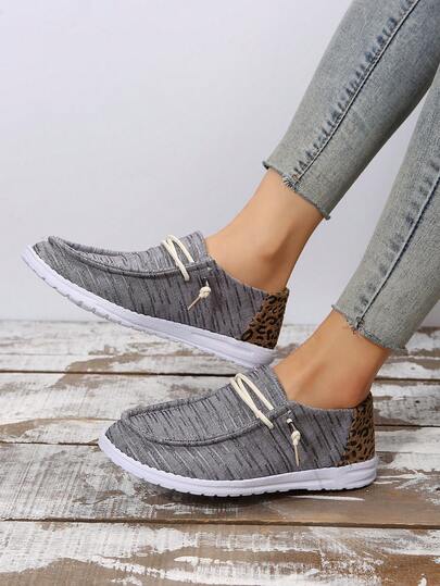 Women Leopard Pattern Slip On Shoes, Canvas Lace-up Front Sporty Sneakers - Grey - View 1