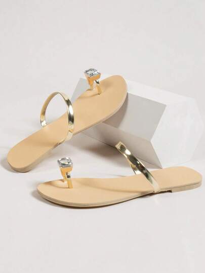 Women Metallic Rhinestone Decor Thong Sandals, Glamorous Summer Flat Sandals - Gold - View 1
