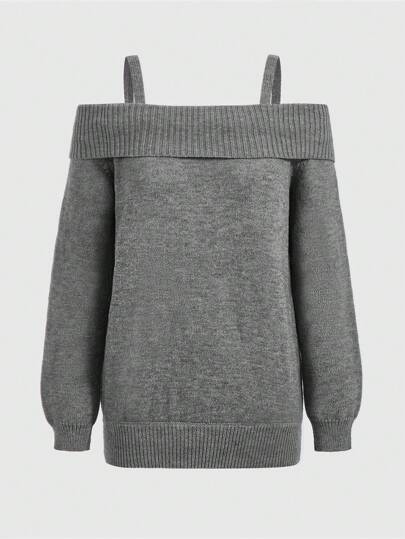 ROMWE Kawaii Women Plus Size Loose Fit Off Shoulder Long Plus Size Pullover Sweater - Grey - View 1