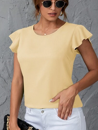 SHEIN Clasi Women Solid Color Casual Round Neck Ruffle Sleeve Short Sleeve Blouse - Apricot - View 1
