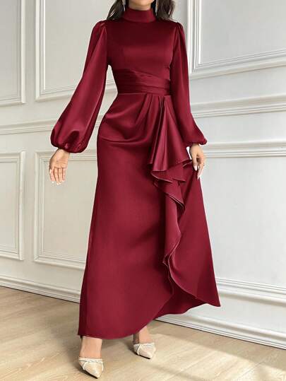 Modelyn Women Solid Color Stand Collar Ruffle Trim Elegant Long Sleeve Dress Long Evening Dresses - Burgundy - View 1