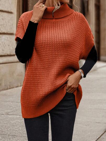 SHEIN LUNE Women Solid Color Turtleneck Ribbed Knit Casual Sweater Vest - Orange - View 1