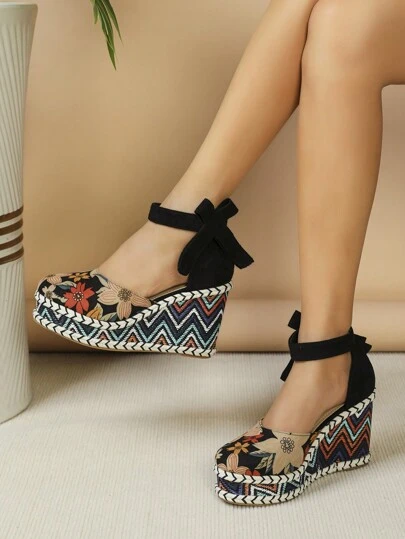 Women Bow Decor Floral Pattern Wedge Shoes, Vacation Outdoor Faux Suede Court Wedges - Multicolor - View 1