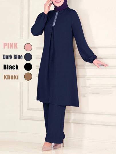 Women's Casual Modest Muslim Style Solid Color Round Neck Top With Loose Pants 2-Piece Set, Dignified And Appropriate - Navy Blue - View 1