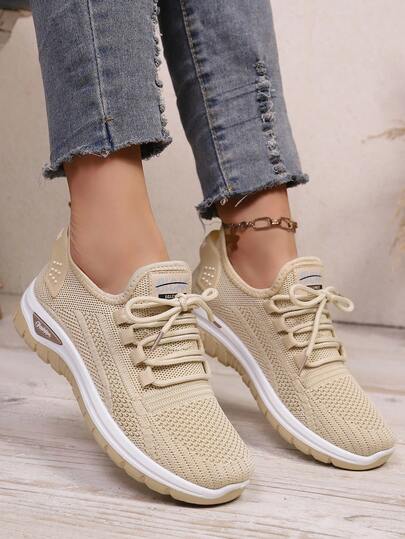 2026 New Women's Casual Sports Shoes, Non-Slip, Wear-Resistant, Comfortable, Breathable Mesh, Solid Color, Simple, Multi-Color Options, Thick Sole, Wear-Resistant, Low-Top, Lace-Up, Heel Tab, Suitable For Outdoor Hiking, Trekking, Daily Commute - Beige - View 1