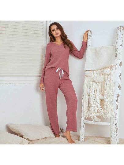 Women's Fall Winter Home Clothes Set, Waffle Grid Pattern, Long Sleeve Long Pajamas Suit - Burgundy - View 2
