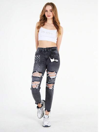 Women's Heart Print Pocket Distressed Skinny Casual Jeans, Versatile - Grey - View 1