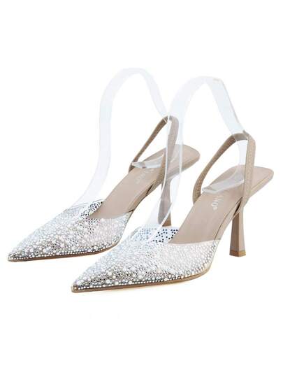 Women's High Heels, Transparent Exposed Heels, Pearl Rivets, Pointed Kitten Heels, Shiny Rhinestones, Set In Wedding Party Shoes - Apricot - View 1